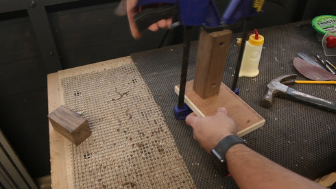 The piece can be joined together now using the dowels and wood glue. A couple of clamps hold them in place while the wood glue dries.